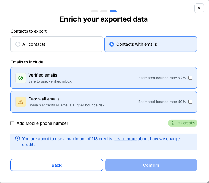 Catch-all email : Nous n'exporterons que les contacts pour lesquels nous disposons d'un email, qu'il s'agisse d'un email vérifié ou probable. Dans cet exemple, cela signifie que nous rechercherons les 4 premiers contacts (si 4 peuvent être trouvés) avec un email.