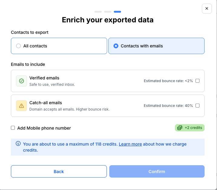 Als je hebt aangegeven dat je alleen bedrijven wilt exporteren die contactpersonen met (geverifieerde) e-mails hebben, en we voor sommige van die bedrijven geen contactpersonen met (geverifieerde) e-mails kunnen vinden, exporteren we die bedrijven niet.